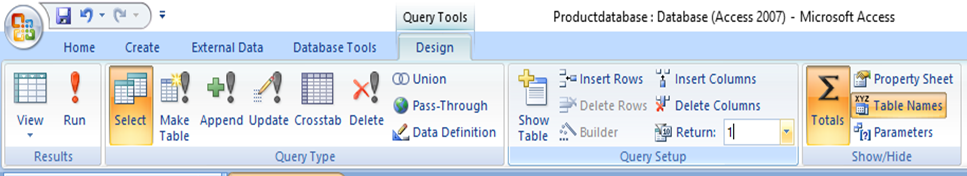 Step 8:- Select 1 value in Return Field under Query Setup of Design Tab and Run Query. Select 1 value is used return (display) only one record from table.